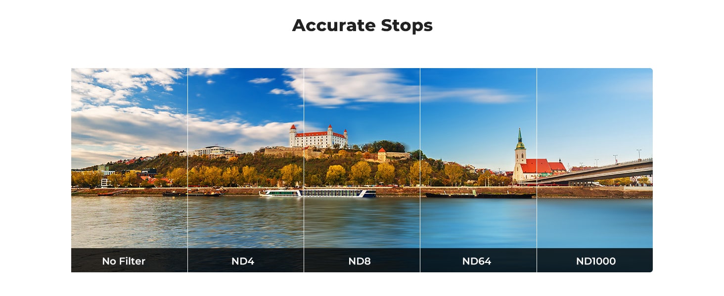 • Light Reduction: 2-stop (ND4), 3-stop (ND8), 6-stop (ND64), 10-stop (ND1000)